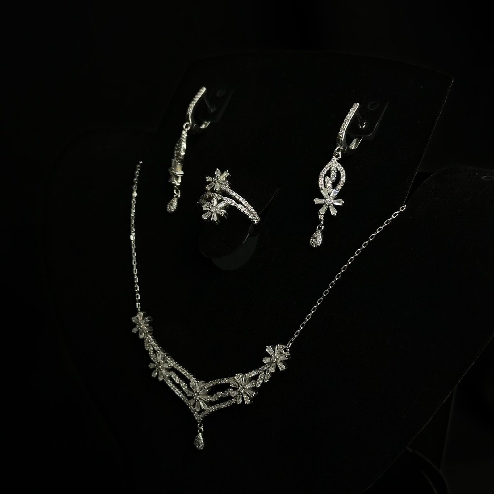 Bernadette Gümüş dəst Zərif və dəbli görünüşünüzü tamamlayacaq bu gümüş dəst, gündəlik istifadə üçün olduğu qədər xüsusi günlər üçün də ideal seçimdir. Dəstə üzük, boyunbağı, sırğa və qolbaq daxil olmaqla, tam uyğunluq və harmoniya təqdim olunur.