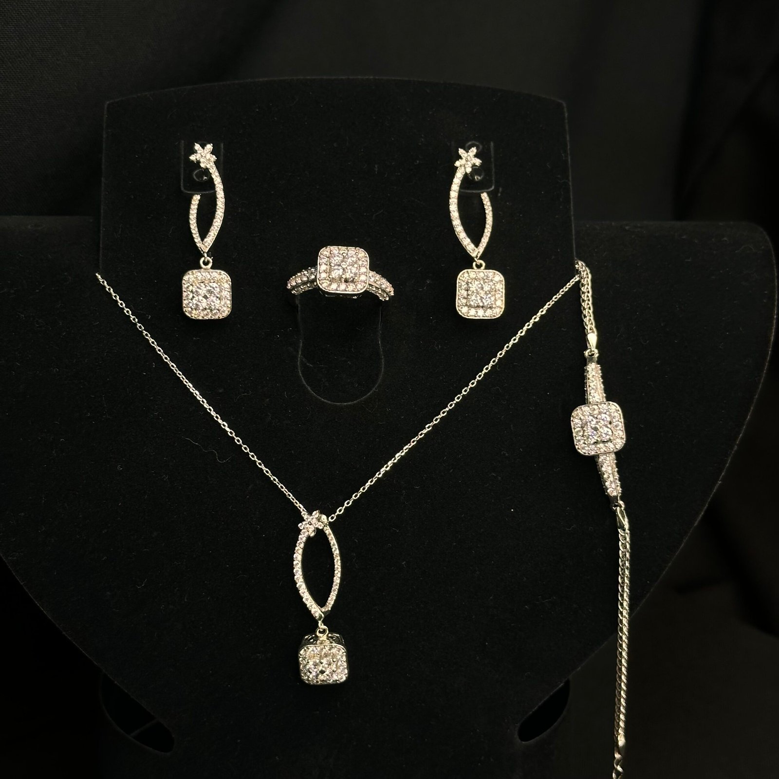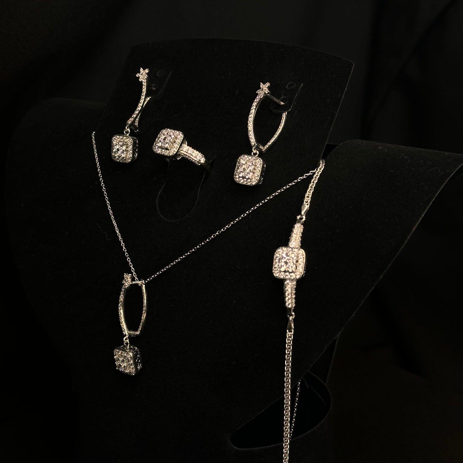 Eliza Gümüş dəst Zərif və dəbli görünüşünüzü tamamlayacaq bu gümüş dəst, gündəlik istifadə üçün olduğu qədər xüsusi günlər üçün də ideal seçimdir. Dəstə üzük, boyunbağı, sırğa və qolbaq daxil olmaqla, tam uyğunluq və harmoniya təqdim olunur.