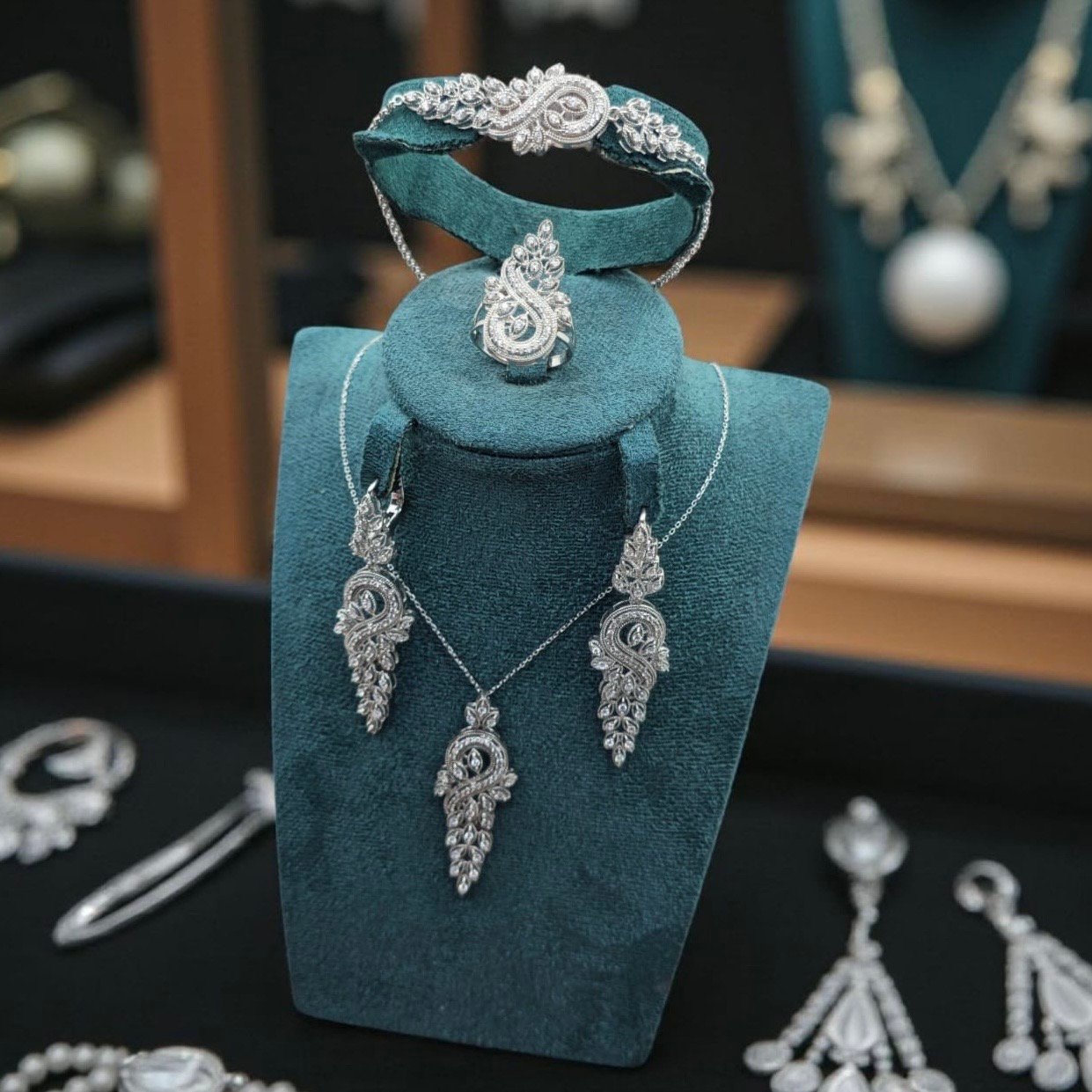 Fatima Gümüş dəst Zərif və dəbli görünüşünüzü tamamlayacaq bu gümüş dəst, gündəlik istifadə üçün olduğu qədər xüsusi günlər üçün də ideal seçimdir. Dəstə üzük, boyunbağı, sırğa və qolbaq daxil olmaqla, tam uyğunluq və harmoniya təqdim olunur.