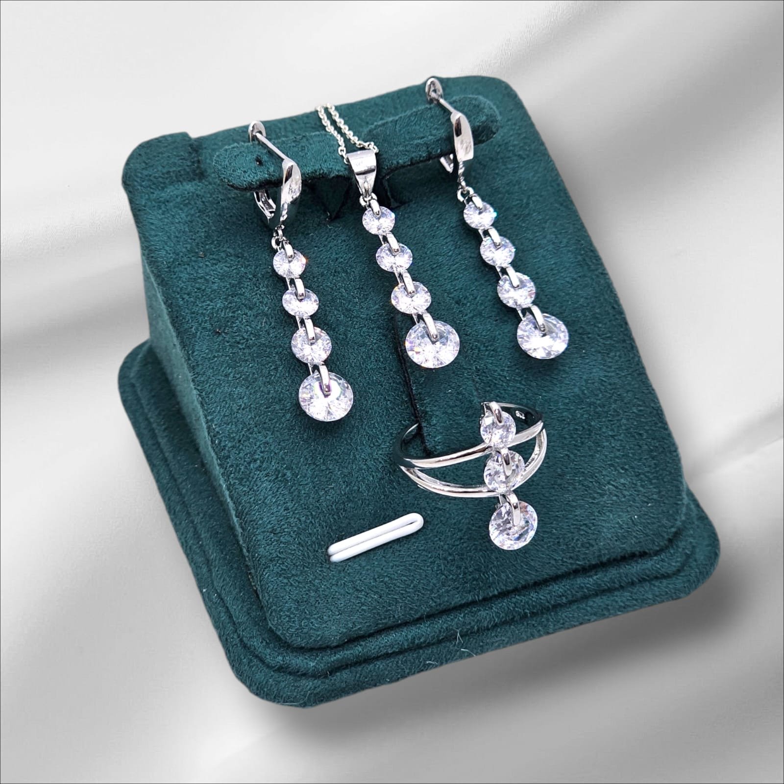 Nicolette Gümüş dəst Zərif və dəbli görünüşünüzü tamamlayacaq bu gümüş dəst, gündəlik istifadə üçün olduğu qədər xüsusi günlər üçün də ideal seçimdir. Dəstə üzük, boyunbağı, sırğa və qolbaq daxil olmaqla, tam uyğunluq və harmoniya təqdim olunur.