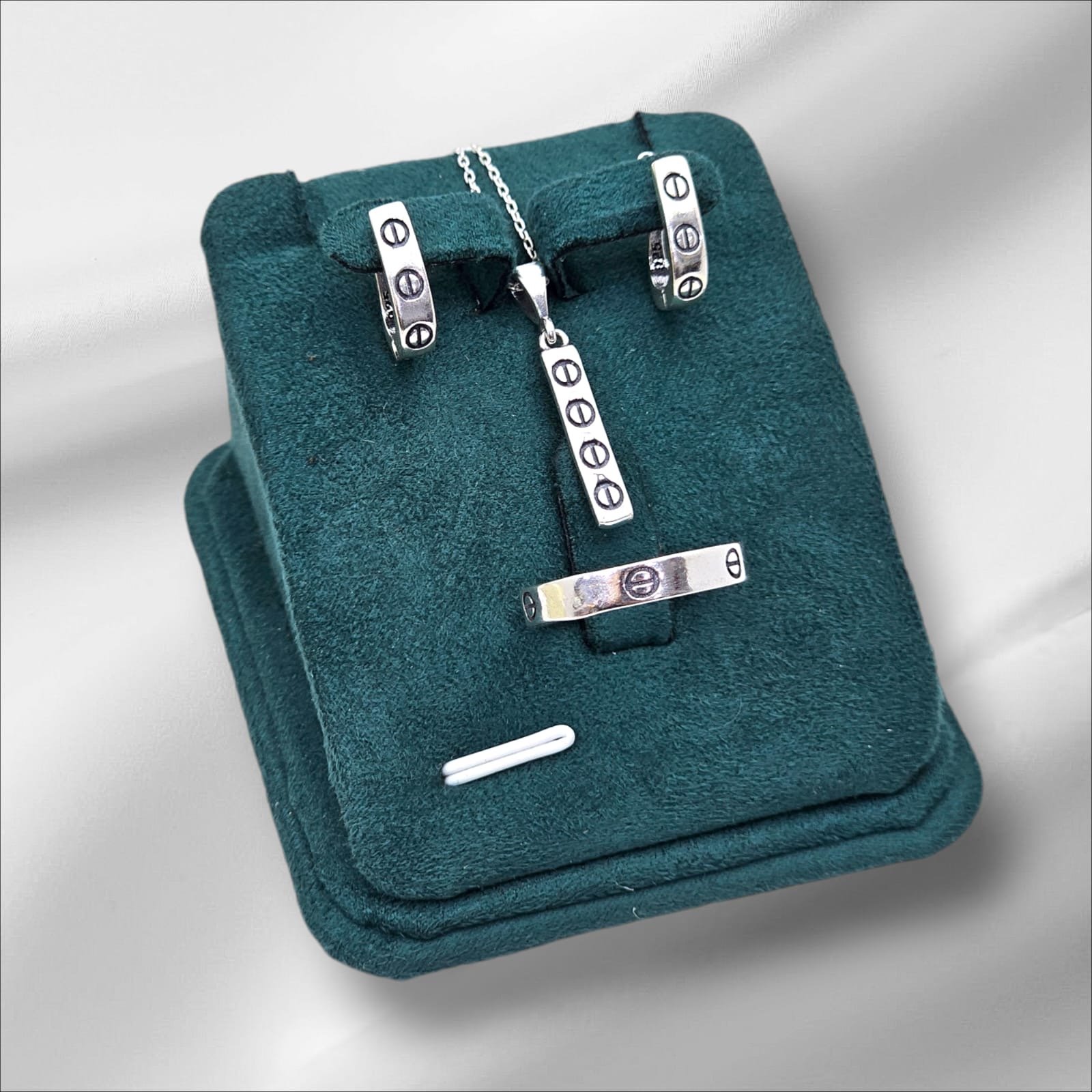 Nikki Gümüş dəst Zərif və dəbli görünüşünüzü tamamlayacaq bu gümüş dəst, gündəlik istifadə üçün olduğu qədər xüsusi günlər üçün də ideal seçimdir. Dəstə üzük, boyunbağı, sırğa və qolbaq daxil olmaqla, tam uyğunluq və harmoniya təqdim olunur.