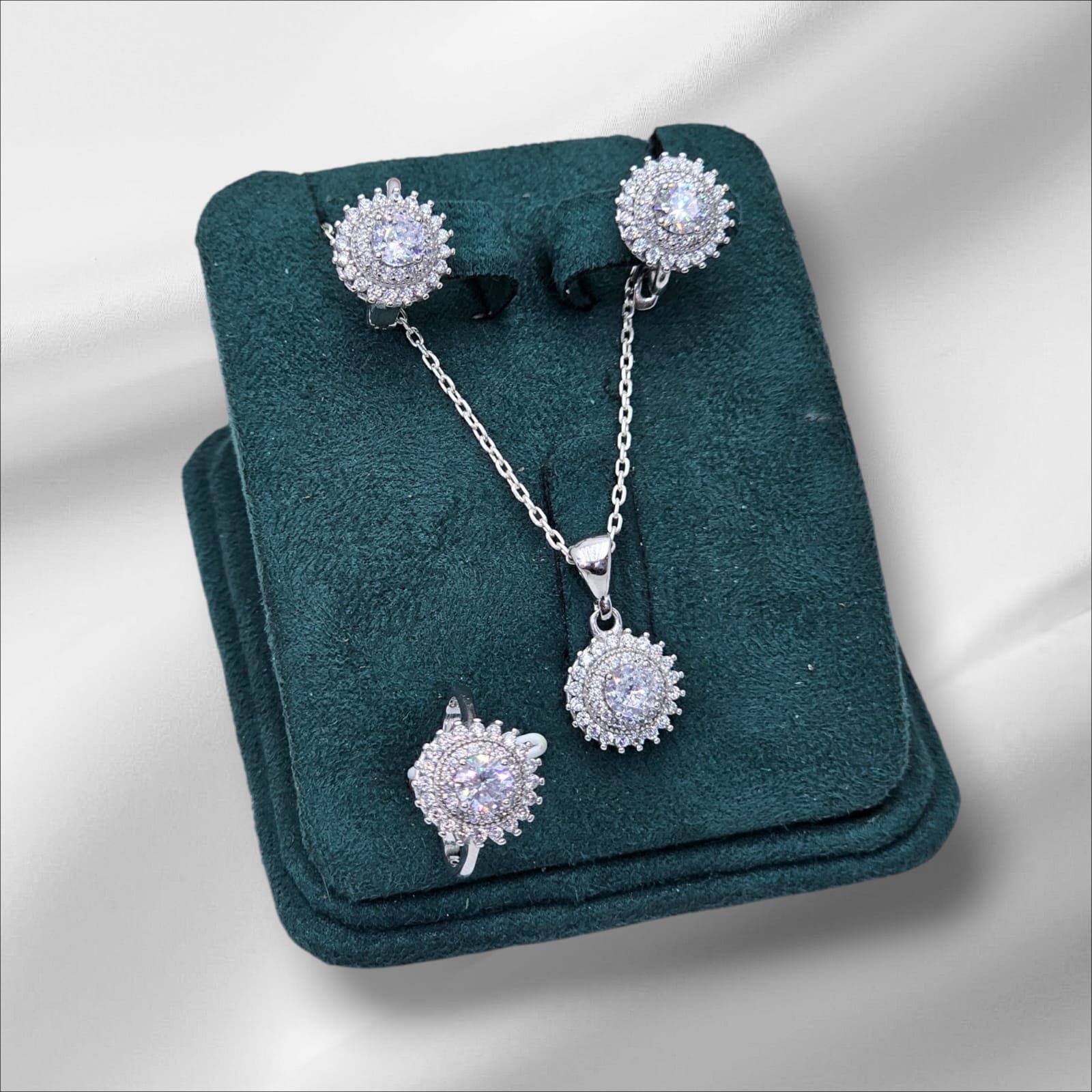 Paulina Gümüş dəst Zərif və dəbli görünüşünüzü tamamlayacaq bu gümüş dəst, gündəlik istifadə üçün olduğu qədər xüsusi günlər üçün də ideal seçimdir. Dəstə üzük, boyunbağı, sırğa və qolbaq daxil olmaqla, tam uyğunluq və harmoniya təqdim olunur.