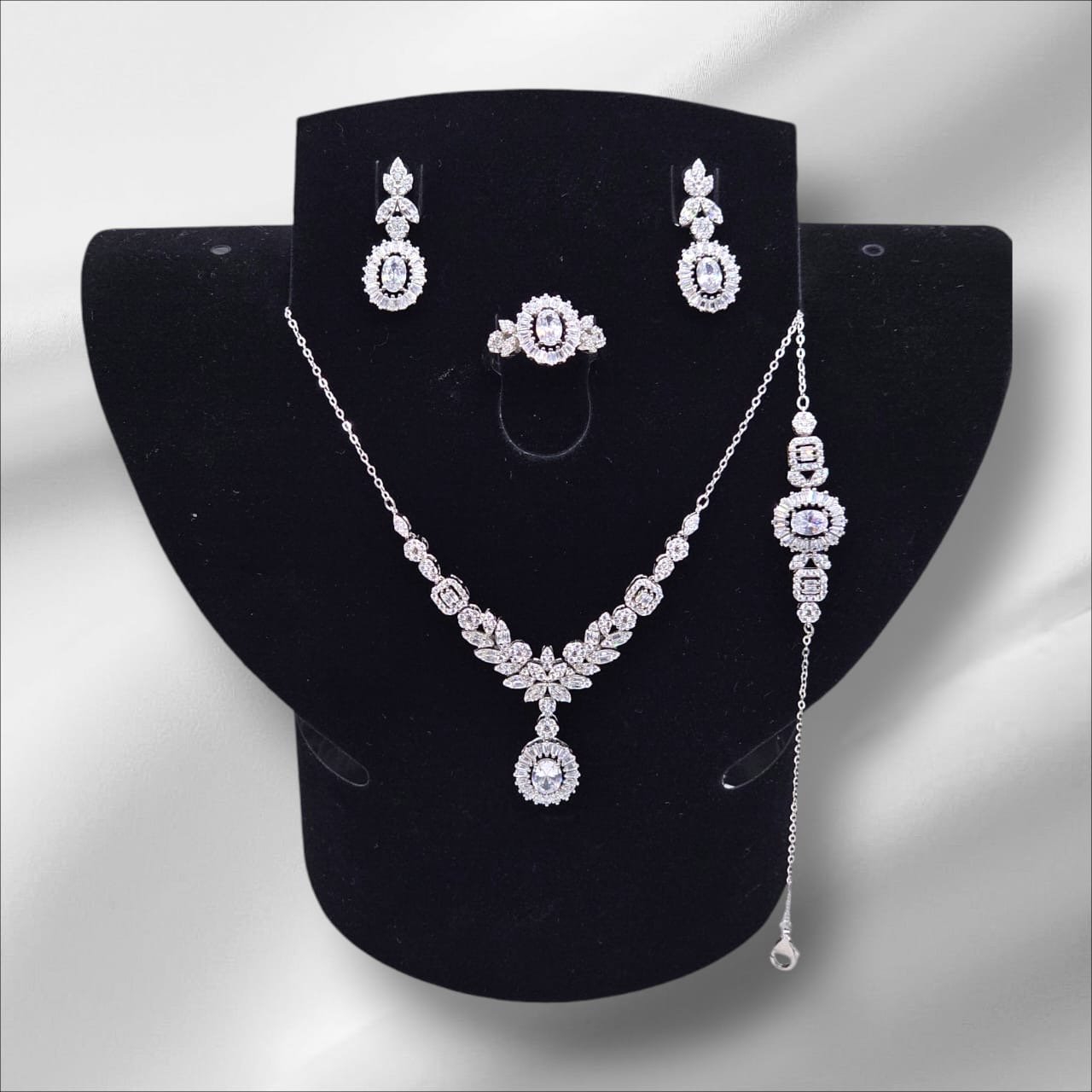 Riley Gümüş dəst Zərif və dəbli görünüşünüzü tamamlayacaq bu gümüş dəst, gündəlik istifadə üçün olduğu qədər xüsusi günlər üçün də ideal seçimdir. Dəstə üzük, boyunbağı, sırğa və qolbaq daxil olmaqla, tam uyğunluq və harmoniya təqdim olunur.