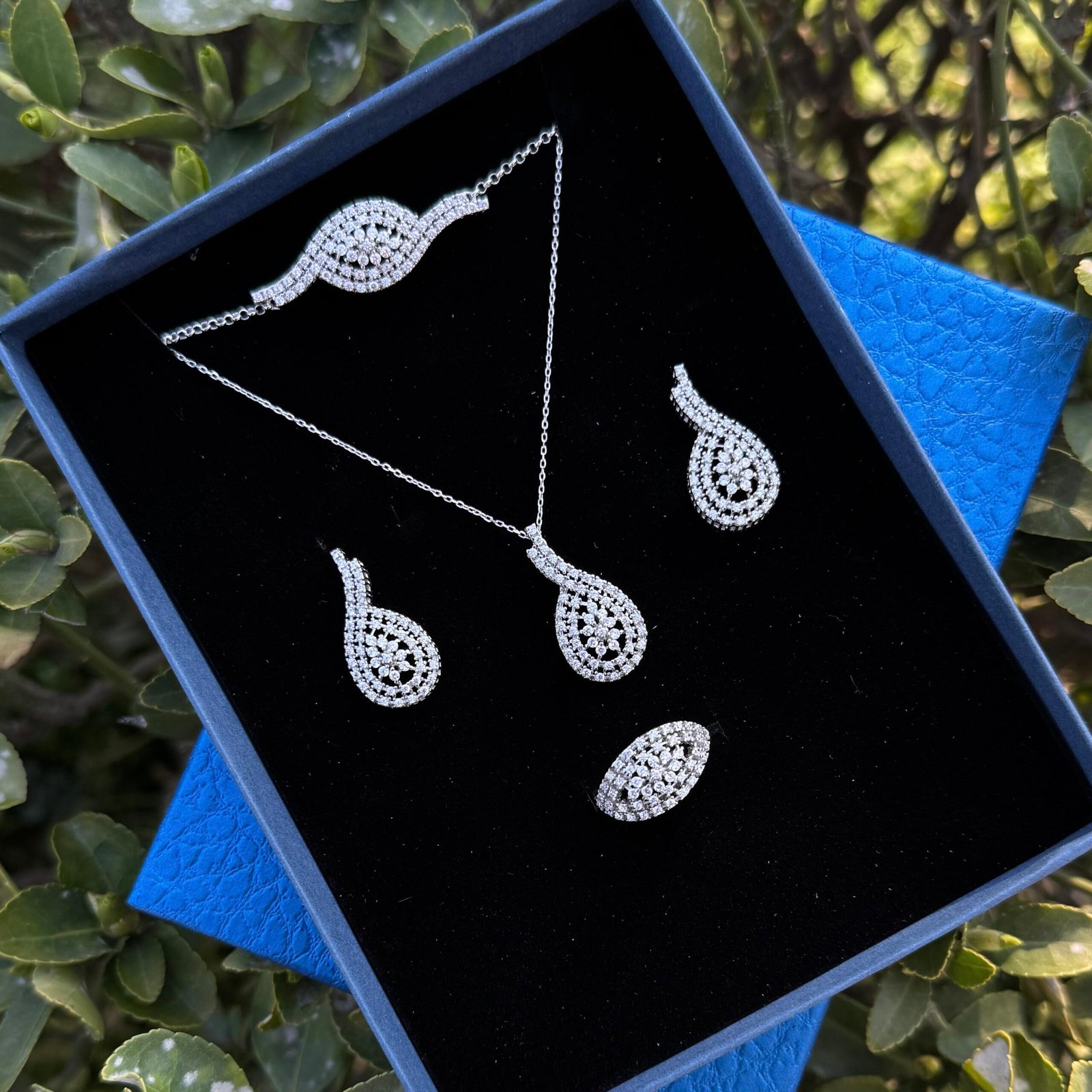 Shaylee Gümüş dəst Zərif və dəbli görünüşünüzü tamamlayacaq bu gümüş dəst, gündəlik istifadə üçün olduğu qədər xüsusi günlər üçün də ideal seçimdir. Dəstə üzük, boyunbağı, sırğa və qolbaq daxil olmaqla, tam uyğunluq və harmoniya təqdim olunur.