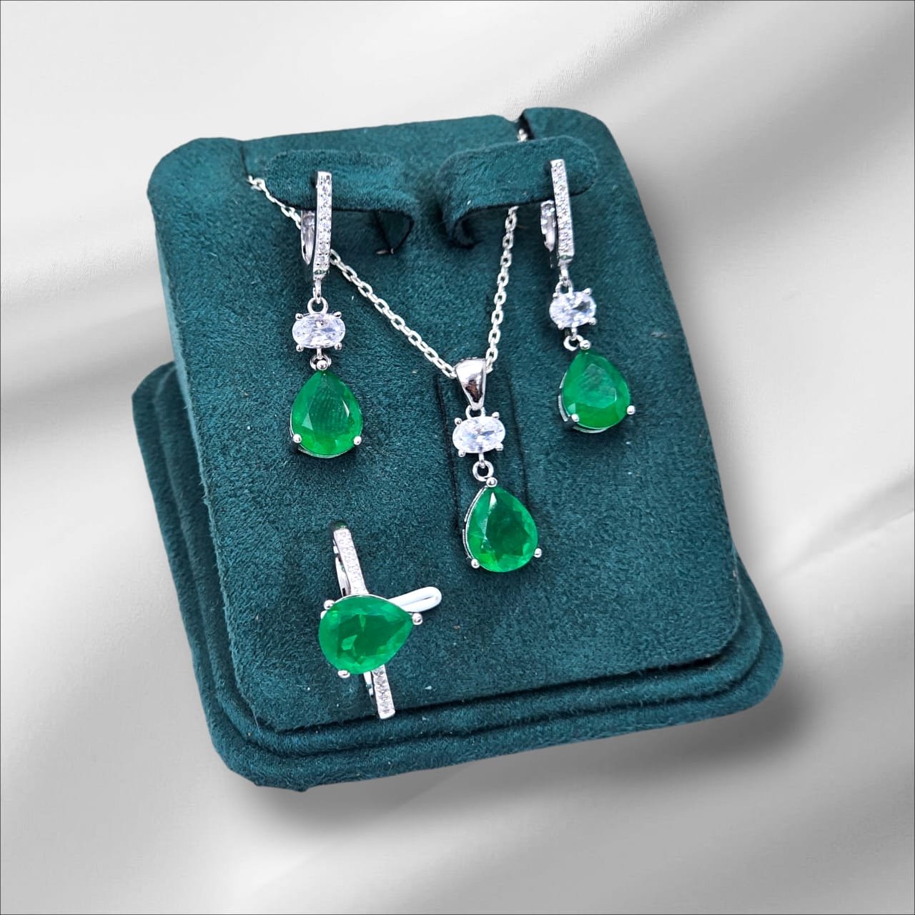Shreya Gümüş dəst Zərif və dəbli görünüşünüzü tamamlayacaq bu gümüş dəst, gündəlik istifadə üçün olduğu qədər xüsusi günlər üçün də ideal seçimdir. Dəstə üzük, boyunbağı, sırğa və qolbaq daxil olmaqla, tam uyğunluq və harmoniya təqdim olunur.