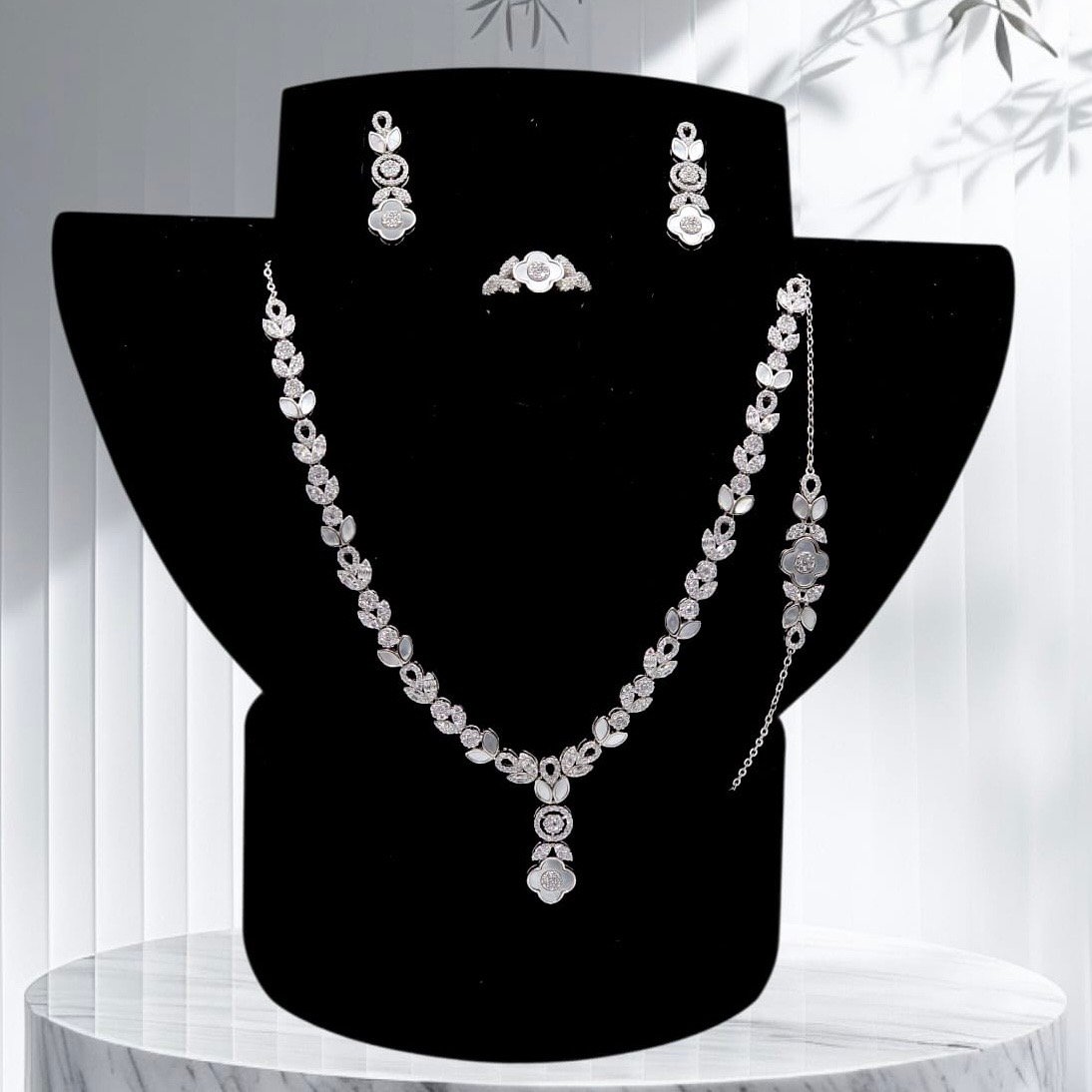 Violet Gümüş dəst Zərif və dəbli görünüşünüzü tamamlayacaq bu gümüş dəst, gündəlik istifadə üçün olduğu qədər xüsusi günlər üçün də ideal seçimdir. Dəstə üzük, boyunbağı, sırğa və qolbaq daxil olmaqla, tam uyğunluq və harmoniya təqdim olunur.